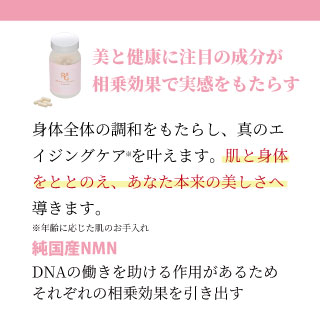 最新の美容成分NMN やDNAといったエイジングケア※着想の成分とアミノ酸などの豊富な美容・健康をサポートする成分が、相互にはたらきかけ合いながら全身へ効率的にめぐり、調和の取れた身体と本来の美しさへ導きます。