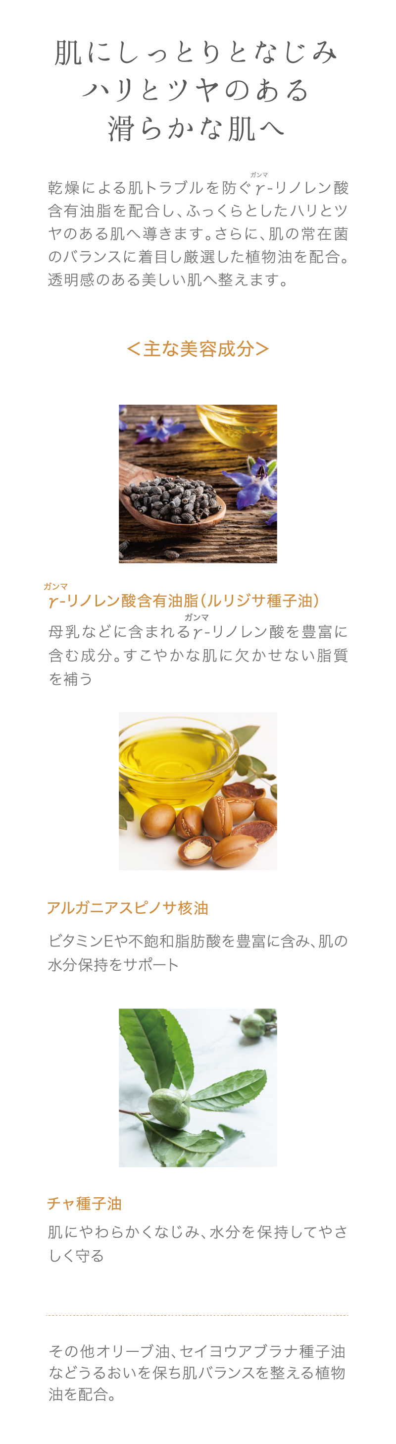 乾燥による肌トラブルを防ぐγ-リノレン酸含有油脂と、肌の常在菌のバランスに着目し厳選した植物油を配合。