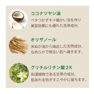 全成分表示 ※クリックで表示します 水、ヤシ油、ミリスチン酸、ヤシ脂肪酸、グリセリン、水酸化K、ラウリン酸K、(ラウリン酸/ミリスチン酸)TEA、ステアラミドDEA、デカオレイン酸ポリグリセリル-10、ステアリン酸、スクワラン、ホホバ種子油、水溶性コラーゲン、ホウセンカエキス、メチルグルセス-10、ホエイ、トコフェロール、グリチルリチン酸2K、オリザノール、アラントイン、ユーカリ葉エキス、褐藻エキス、紅藻エキス、緑藻エキス、ショウガ根エキス、木酢液、プエラリアミリフィカ根エキス、トウガラシエキス、酢酸トコフェロール、イチョウ葉エキス、カキ葉、カリンエキス、ソウハクヒエキス、竹酢液、オタネニンジン根エキス、トマト果実エキス、アロエベラ葉エキス、クマザサ葉エキス、ワカメエキス、シソ葉エキス、ハチミツ、オキナワモズクエキス、ホウレンソウ葉エキス、キャベツ葉エキス、銅クロロフィル、シイタケエキス、パセリエキス、シトロネロール、黒砂糖エキス、ダイズ種子エキス、鉱泉塩、ケイ酸(Na/Mg)、センブリエキス、ニンジン根エキス、ビワ葉エキス、ツルレイシ果実エキス、ゴボウ根エキス、オトギリソウエキス、ヒノキ油、ニンニク根エキス、タイム油、イランイラン花油、ビターオレンジ花エキス、ベルガモット果実油、ゴマ油、金、オレンジ油、ライム油、キビ種子エキス、ナンバンアイエキス、キトサン、オオムギ種子エキス、セリエキス、ヨモギ葉エキス、フェノキシエタノール