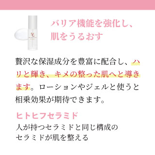 ヒト幹細胞順化培養液、NMNなどのエイジングケア※に注目の整肌成分に加え、人の本来持つセラミドと同じ『ヒトヒフセラミド』を保湿成分として配合。
